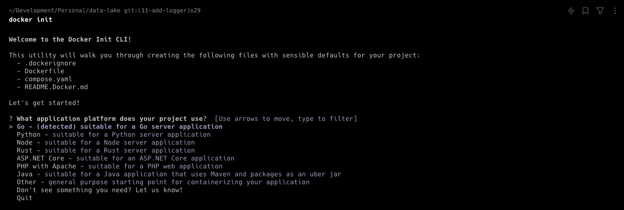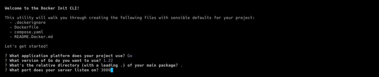For instance, selecting the Go template prompts you for the Go version, the main package directory, and the server listening port. After providing this information, docker init
